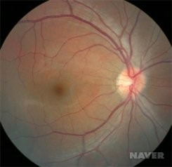 정상안저. 가운데의 동그란 시신경이 주황색으로 보임